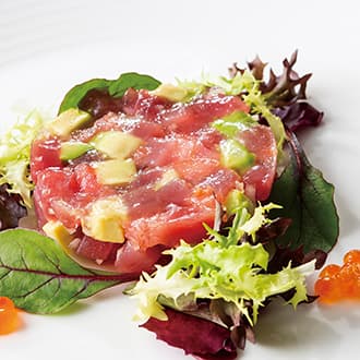 ハマチの白醤油マリネ海老とアボカドのタルタル